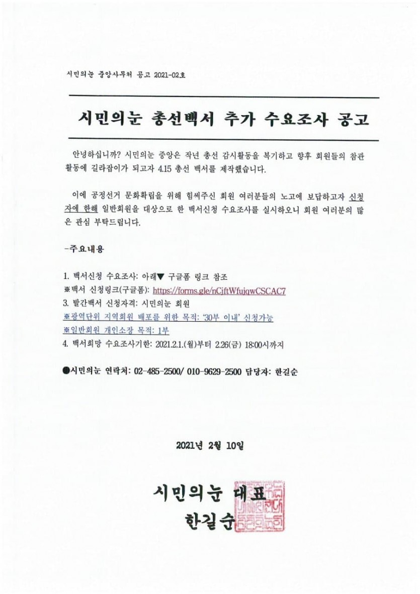 시민의눈 총선백서 추가 수요조사 공고